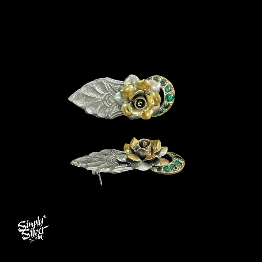 Silver Dual Tone Rose 3D Flower Studs With Green Color Kundan Chaand