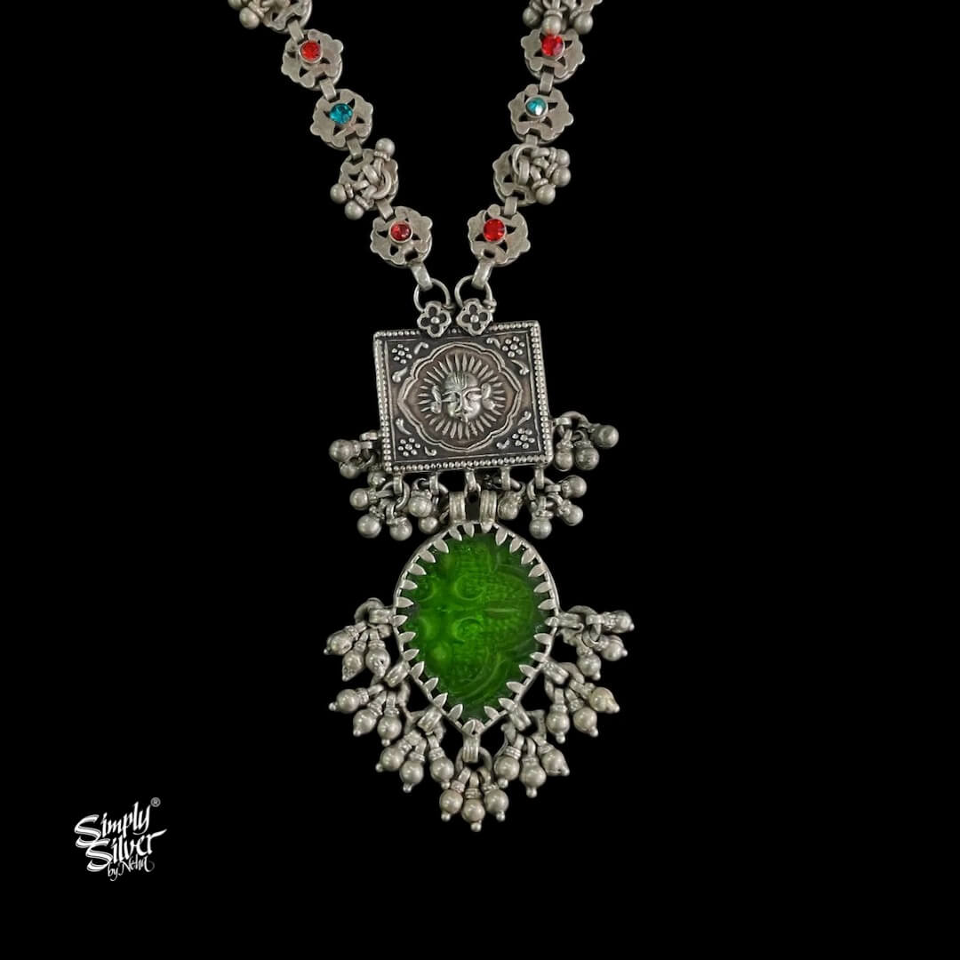 Silver Statement Big Green Glass & Ghungroos Necklace with Multi Color Stone Jaali Chain - MH5912