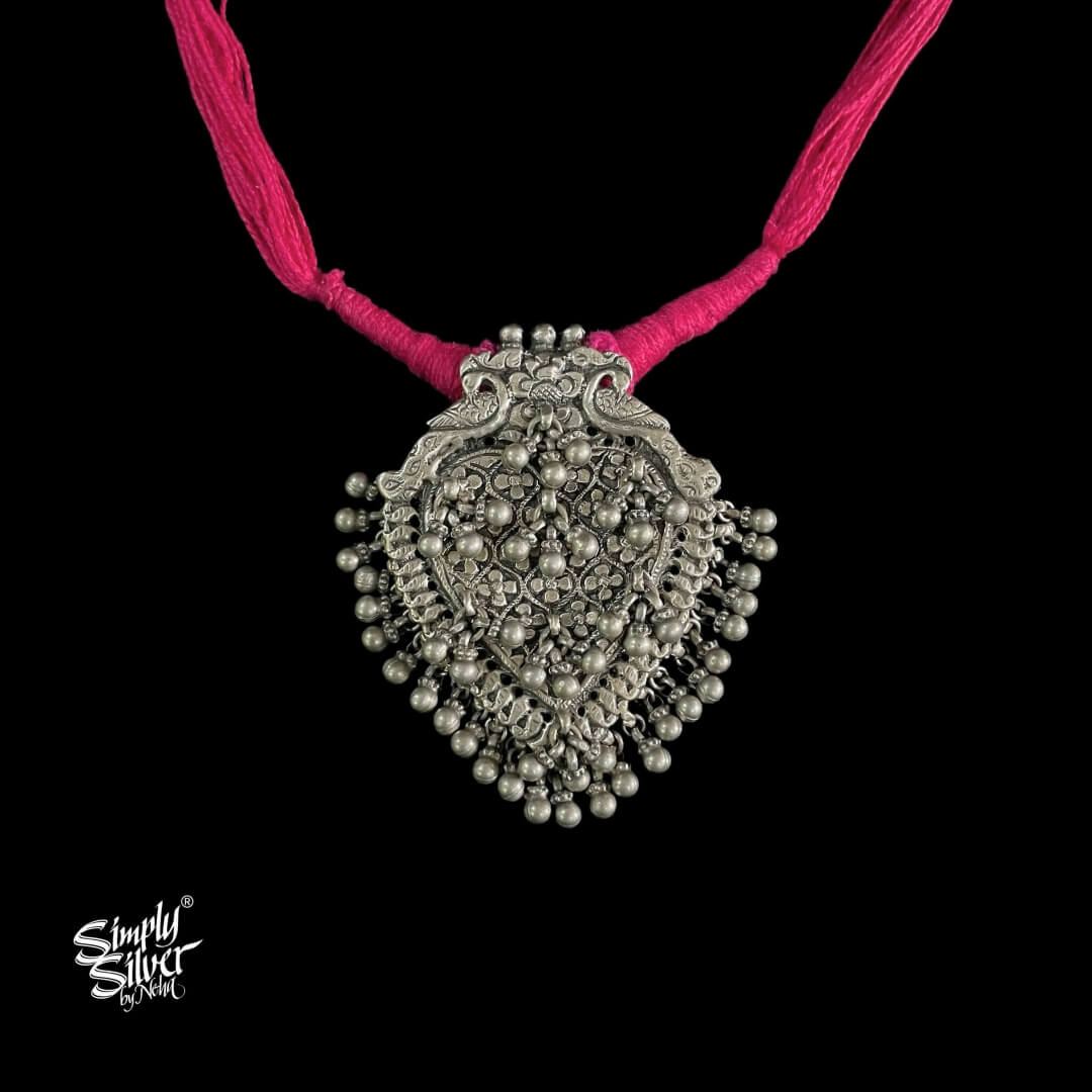 Silver Statement Big Heart Pendant With Peacocks & Ghungroos - MH4540